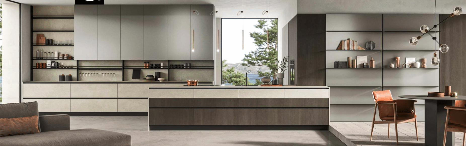 Cuisine avec caractère polyvalent qui trouve son expression esthétique maximum dans le contraste entre la finition des portes plaquées “Rovere grafite cannettato” et celle des portes en cadre aluminium et “Compact Itaca”.